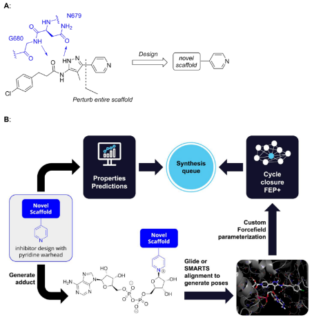 因此,团队创新性的采用先虚拟构建药物NAD⁺ 共价加合物,再通过FEP+预测其结合亲和力的建模流程,最终成功预测了新型双环支架(如咪唑并吡啶类)的结合模式,加速了苗头化合物的发现。