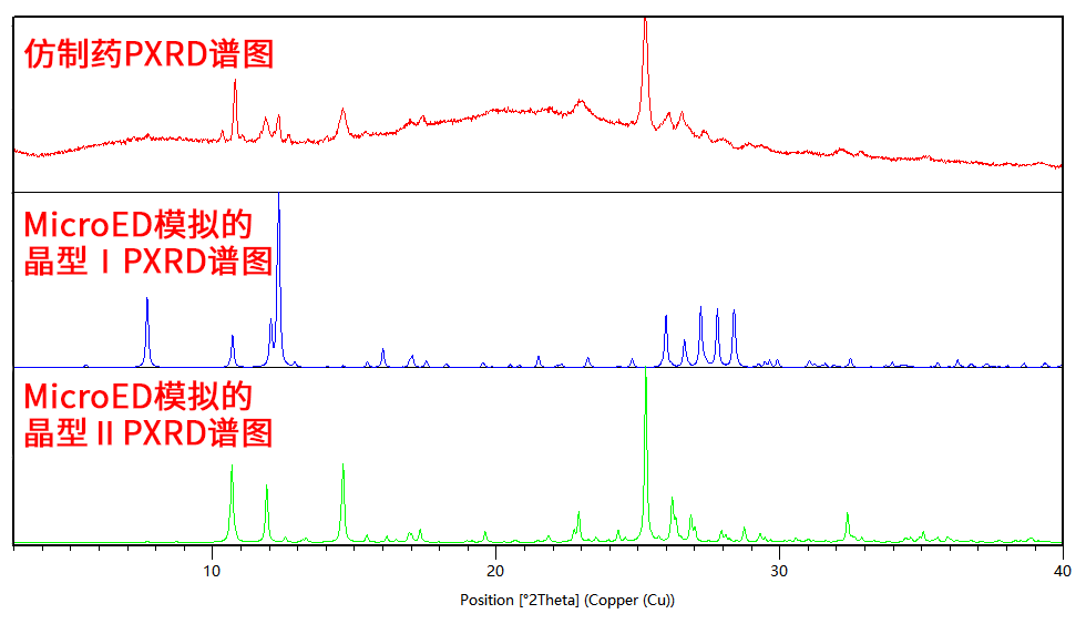 MicroED模拟的晶型I和晶型II PXRD谱图与仿制药实测谱图比对